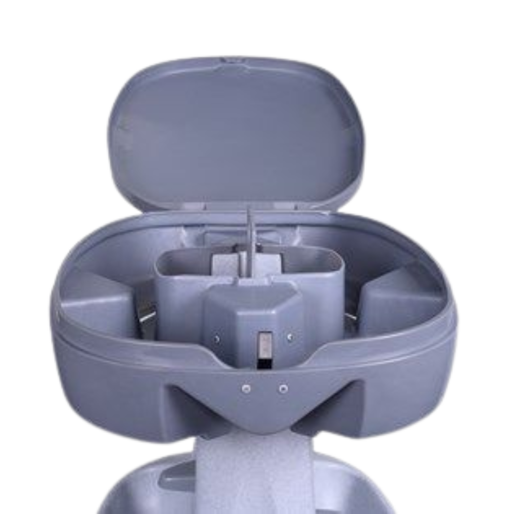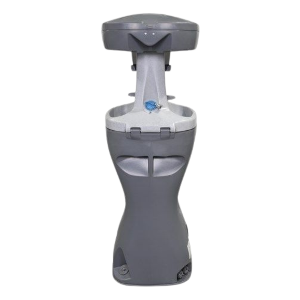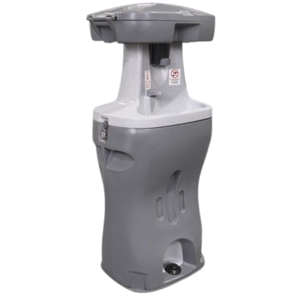 The Dual Sided Handwash Station is a two-station portable sink that features two soap dispensers, four paper towel dispensers, and hands-free, foot-pump operation.